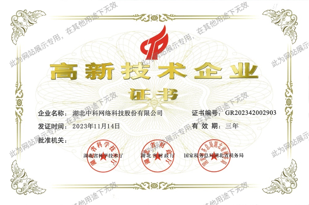 湖北中科網(wǎng)絡科技股份有限公司成立于1998年5月,注冊地為武漢市武昌區(qū),總部位于中國光谷。是智能化、信息化行業(yè)的領軍企業(yè),國家認定的高新技術(shù)企業(yè)、湖北省專精特新企業(yè)。